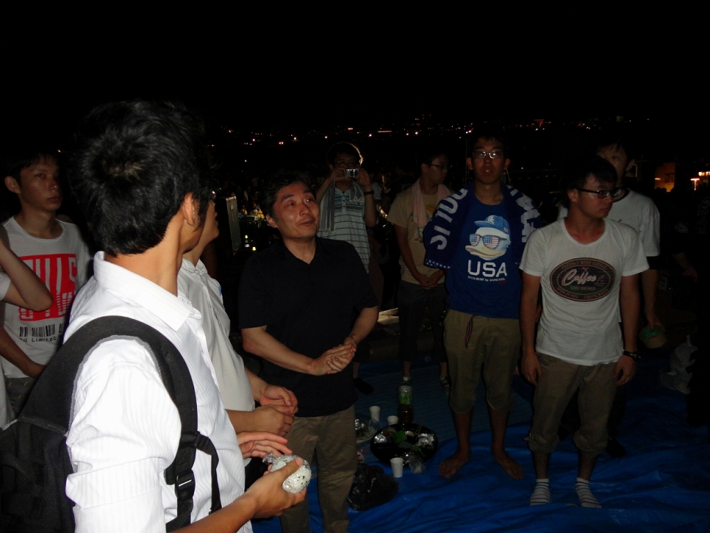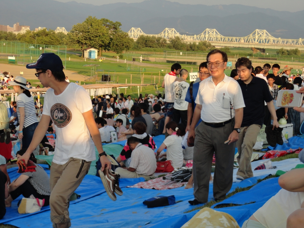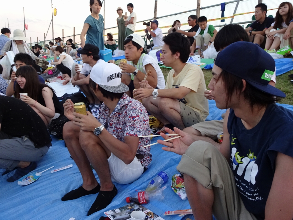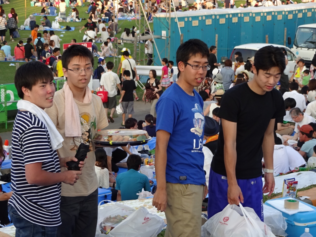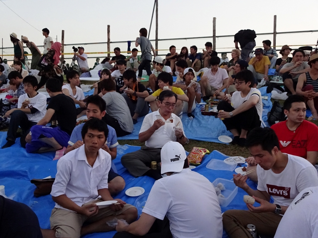 その後,オードブルにおにぎり,飲み物を運び,先輩,お客様を迎え入れました.大所帯での開催でしたが,幹事をはじめ全員が頑張ったおかげで無事開始することができました.この日の観覧者数はなんと56万人でした.