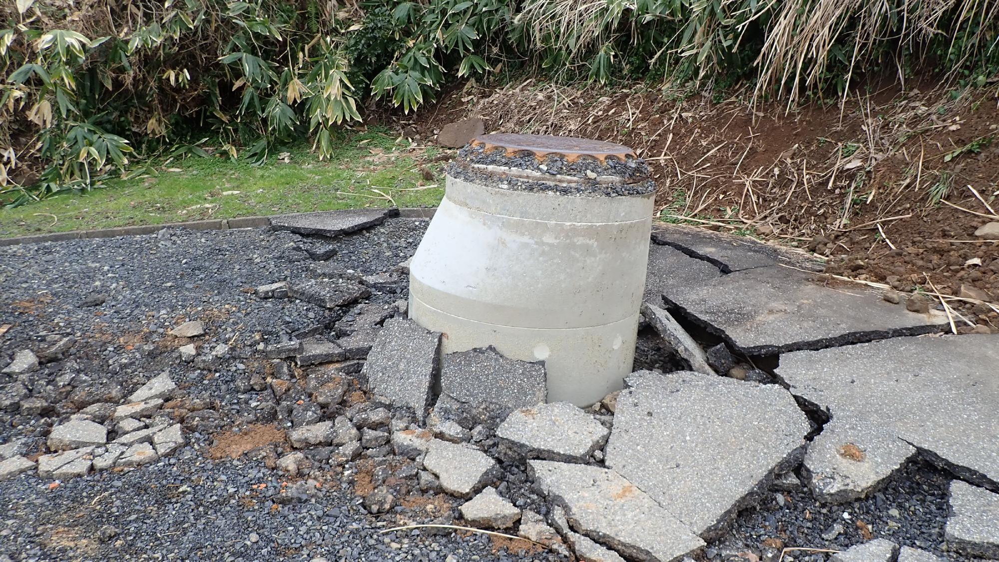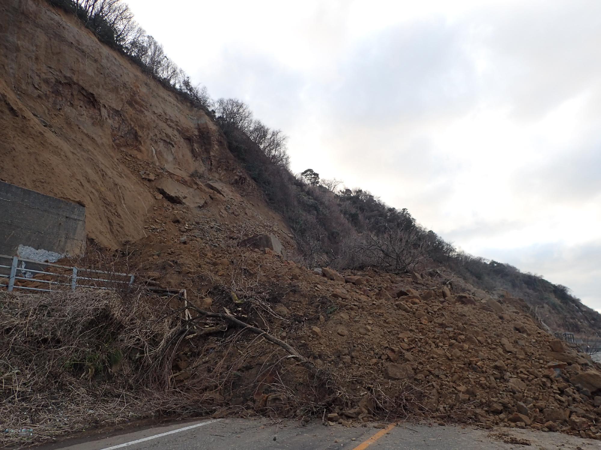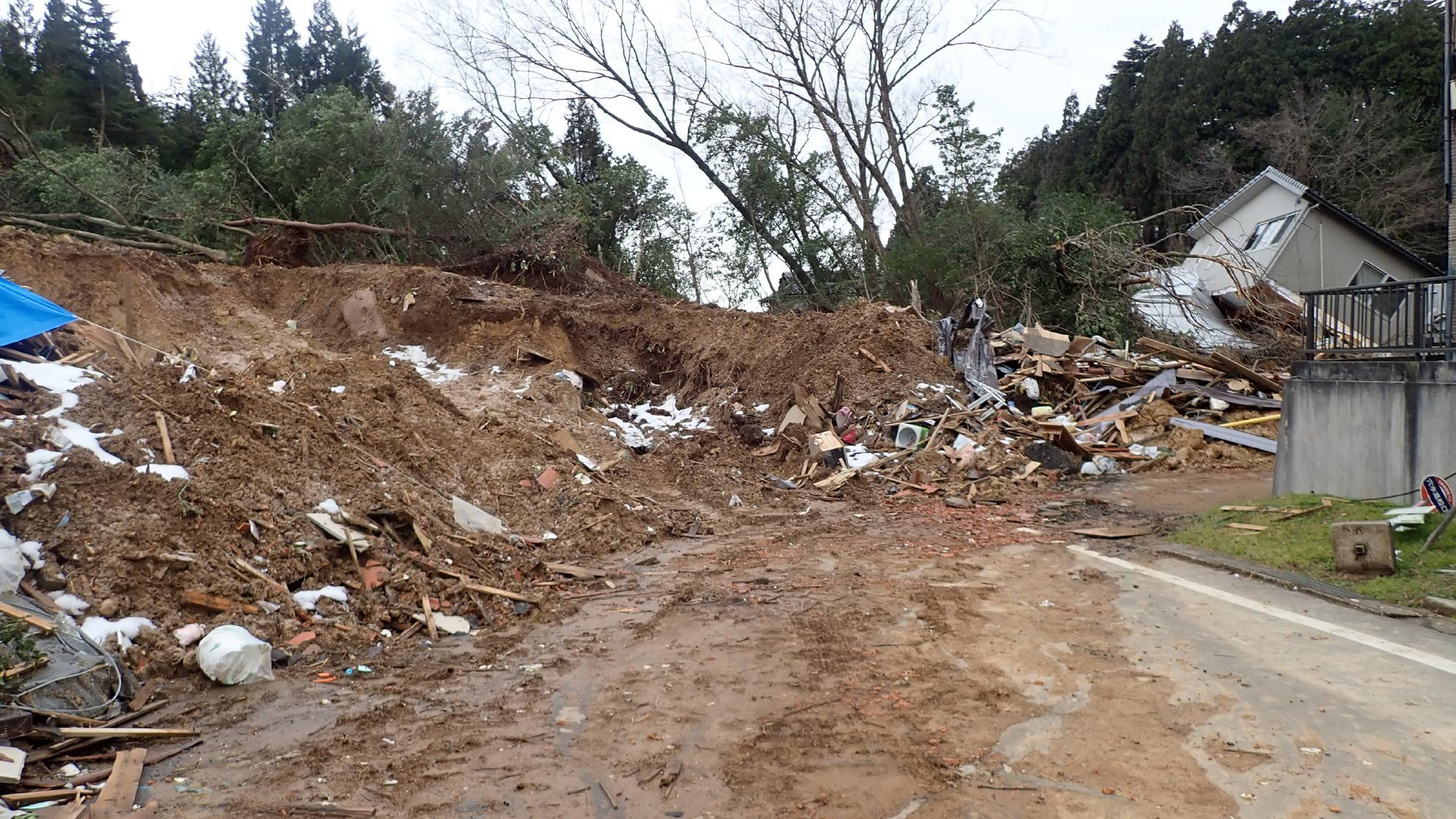 - 穴水町由比ヶ丘では,比較的大規模な斜面崩壊が発生し,建物が数棟倒壊していました.崩壊土砂は粘性土質っぽい土が主体で,低地側に大きく流れ,道路を閉塞していました.崩壊箇所の近くでは,1か所だけマンホールが浮き上がったところがあり,埋め戻し土の液状化も同時に発生した可能性が考えられました.