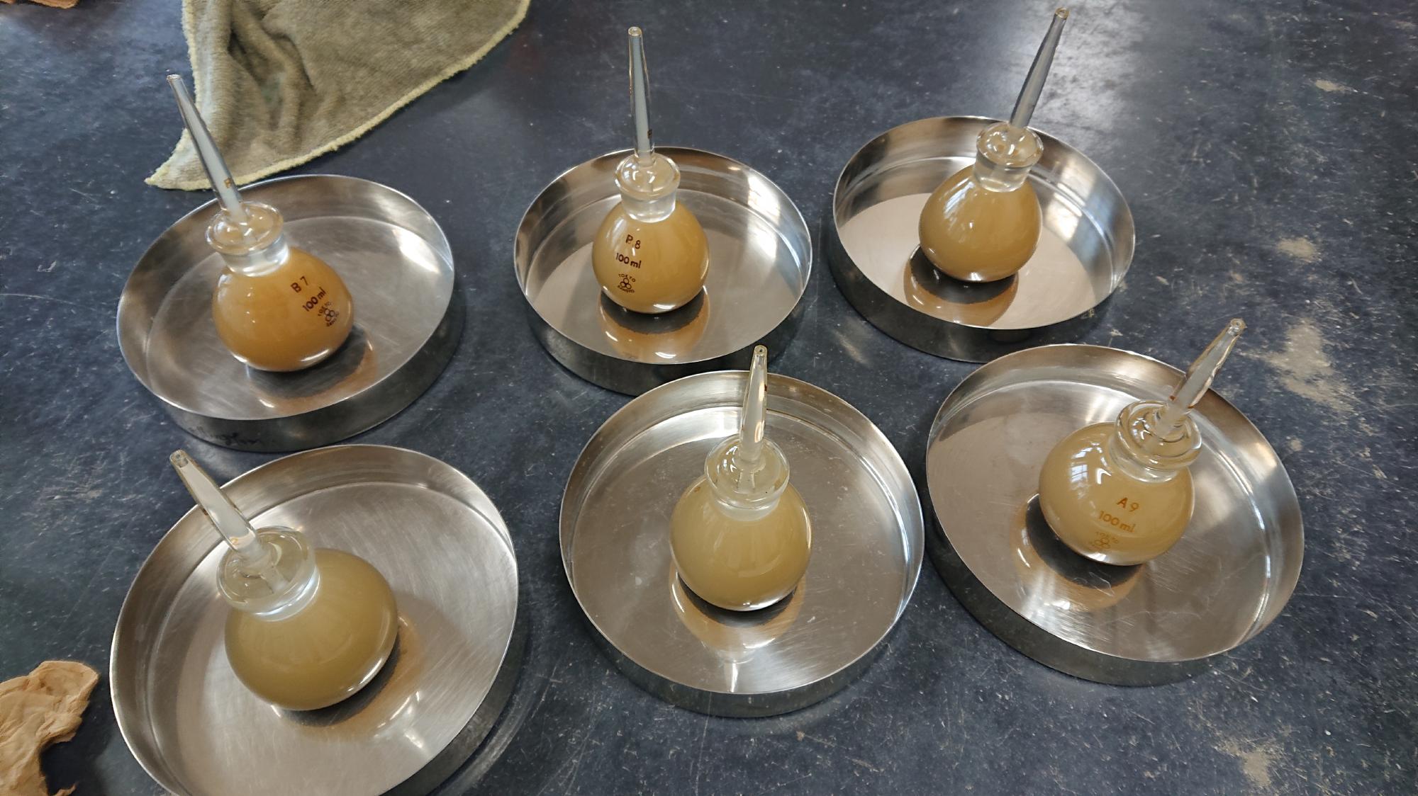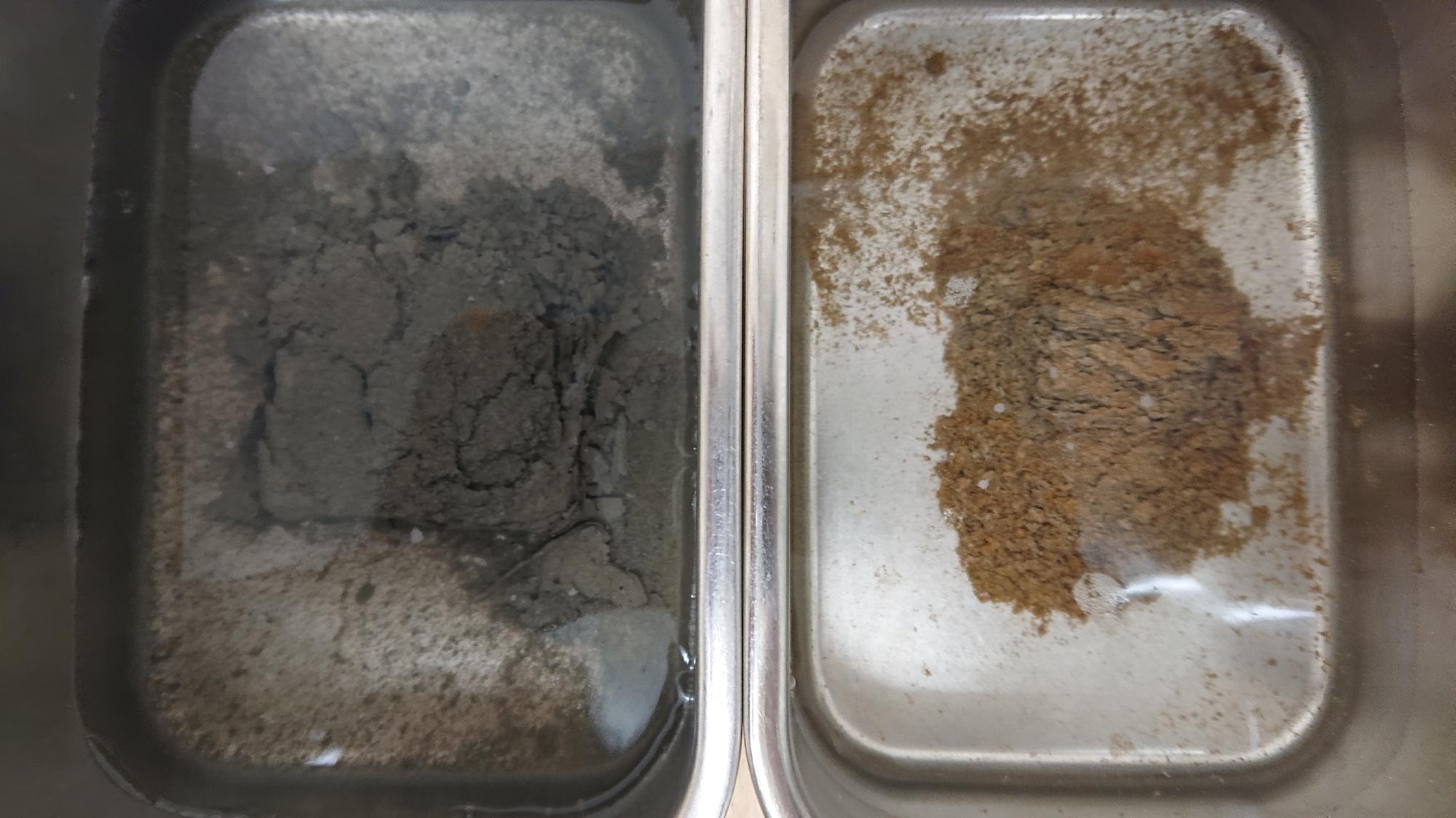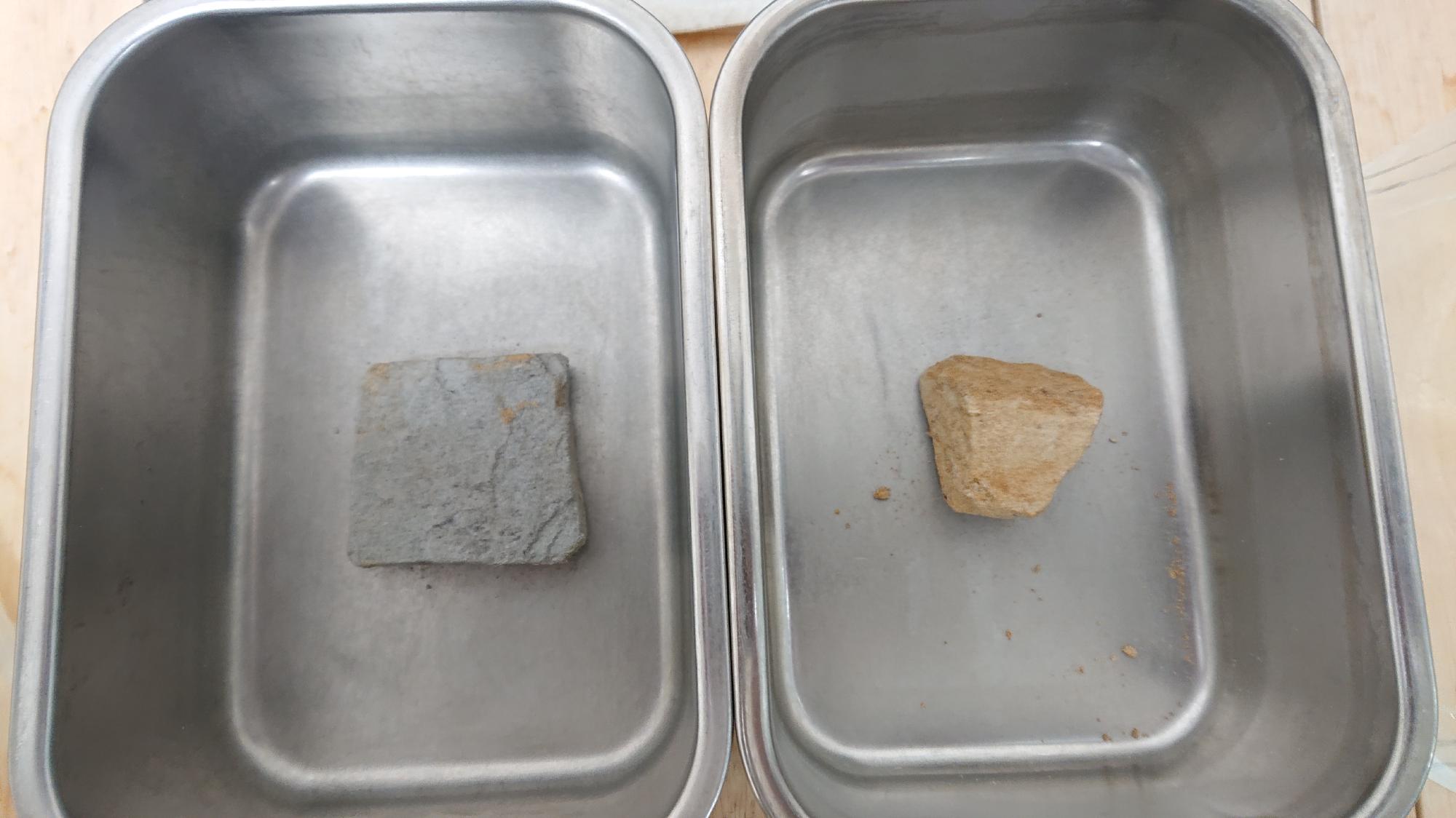 - 本震発生後直ちに,道路防災ドクターを務める豊田教授が北陸地方整備局の要請を受けて国道8号線上越市茶屋ヶ原地先の斜面崩壊現場に行きました.そこで,シルト岩と思われる崩落土砂を2つ採取し,室内において粒度・密度試験,スレーキング試験を行いました.定量的な評価は,ここでは避けますが,水浸後の供試体が写真のようにすぐさま崩壊したことを考えると,非常に脆弱な地盤で構成された斜面だったことが推測されます.