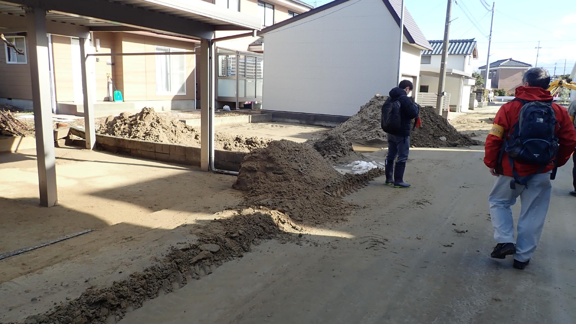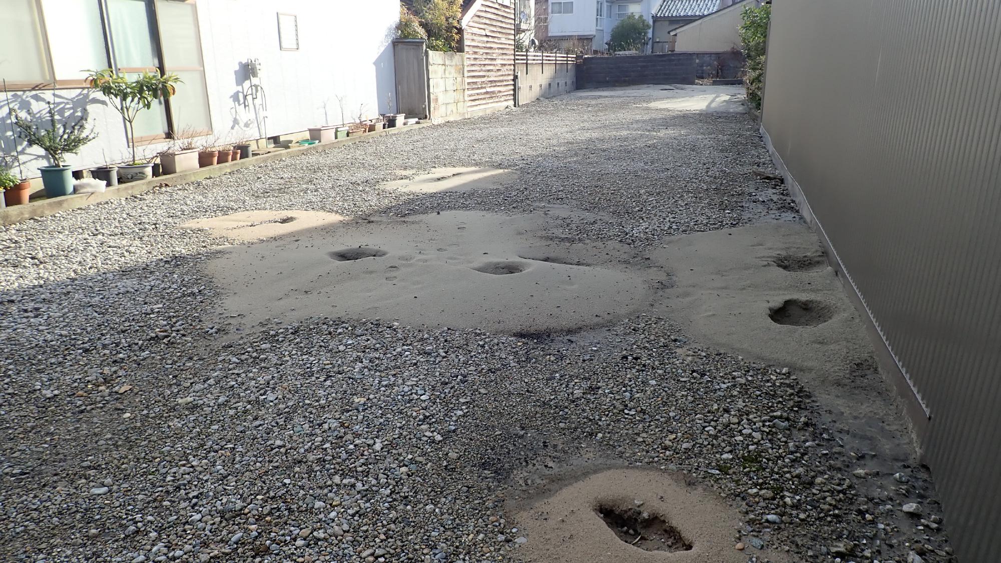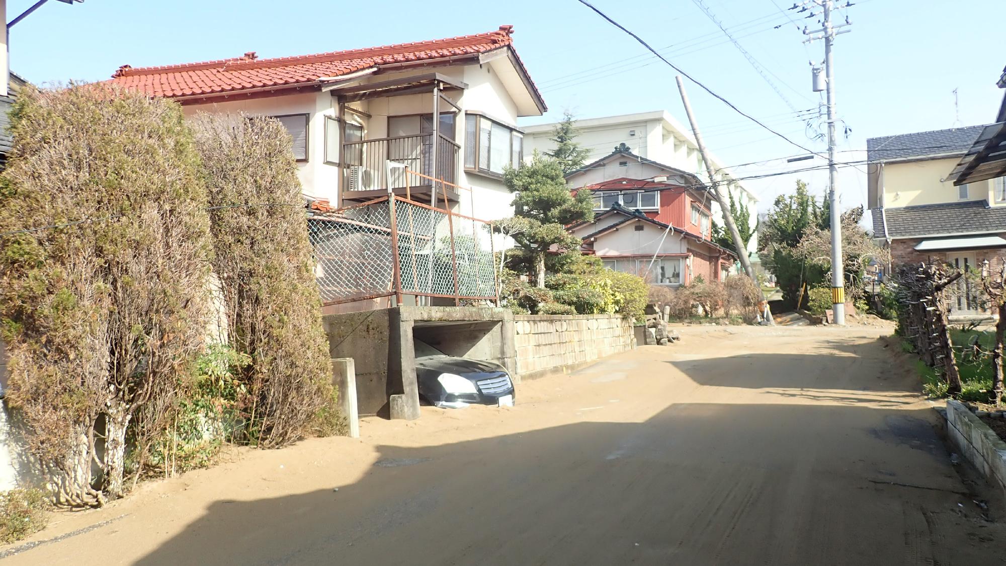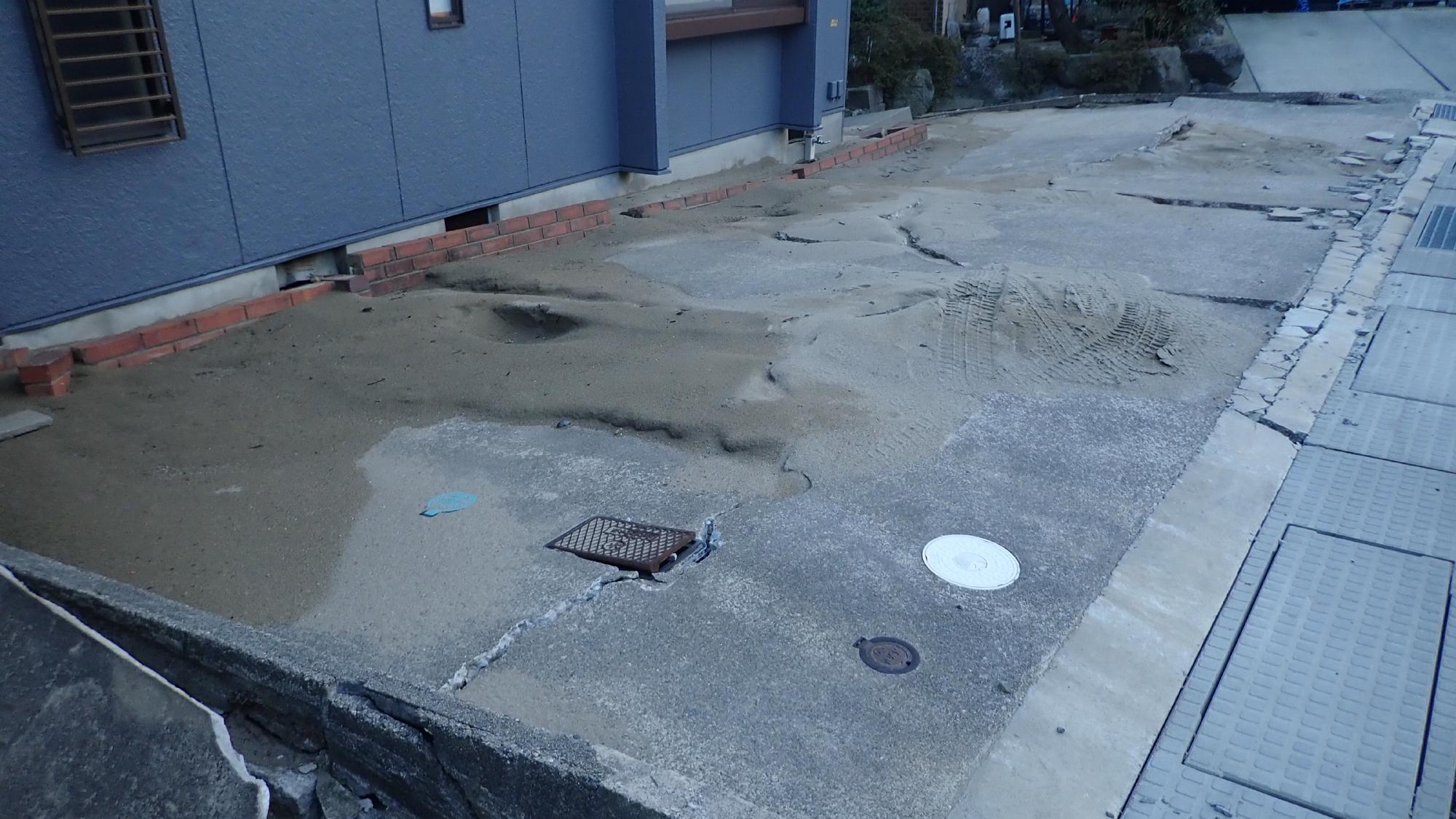 - 駅前中央地区では,被害が限定的でしたが,住宅敷地内で噴砂が発生している箇所,建物の周辺地盤が沈下している箇所が散見されました.建物の被害は確認できませんでした.