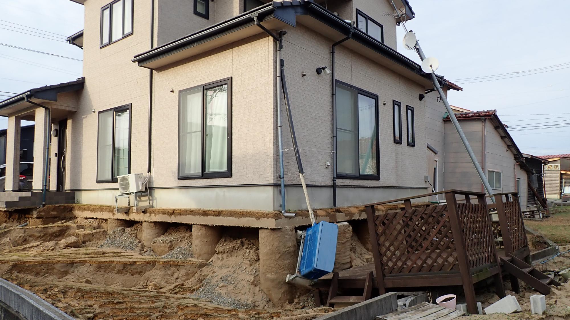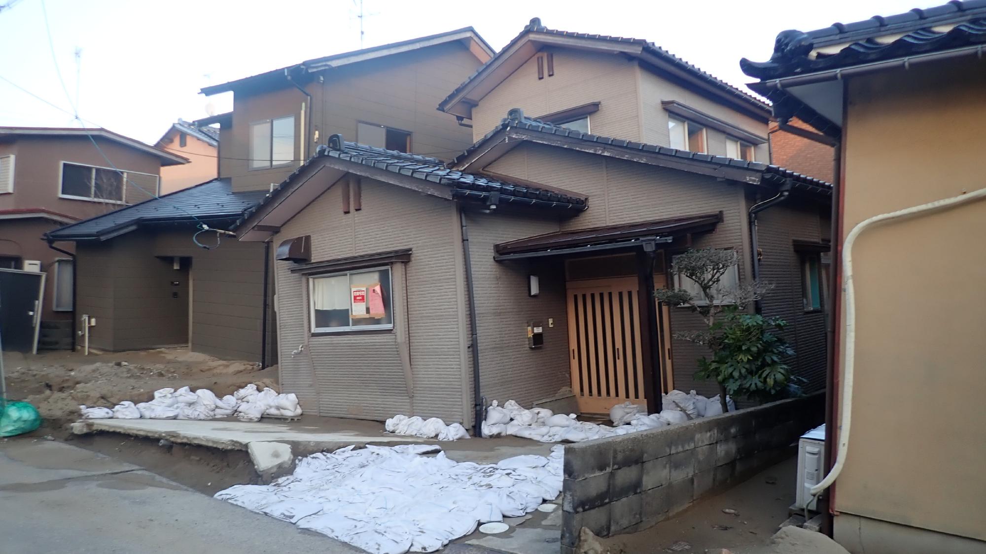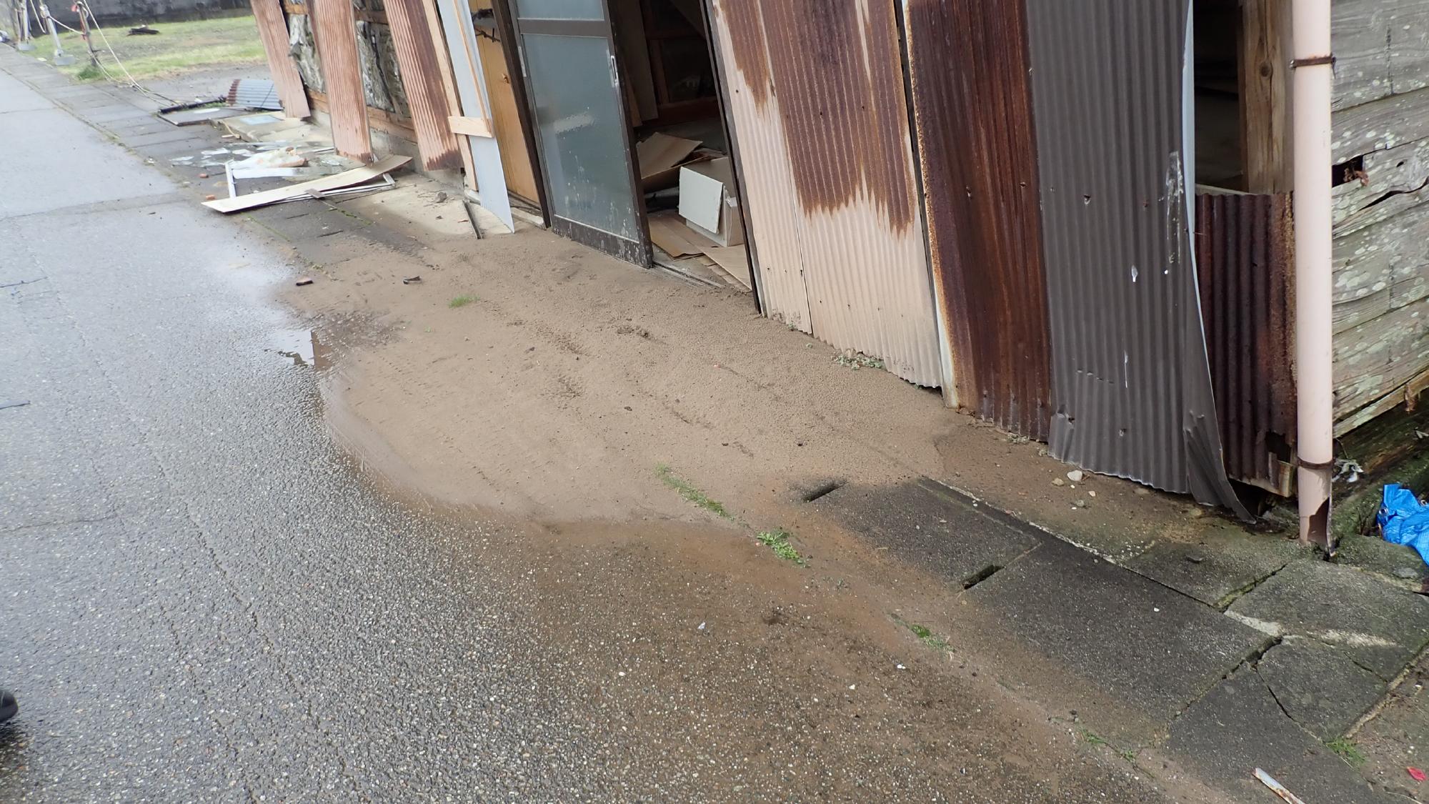 - 高岡市伏木地区では,比較的広域で液状化による噴砂,側溝の圧縮,建物の傾斜が発生していました.氷見と七尾同様に海沿いで,標高差が少ない平坦な地域でしたので,側方流動による建物傾斜や地盤の隆起はあまり確認できませんでした.