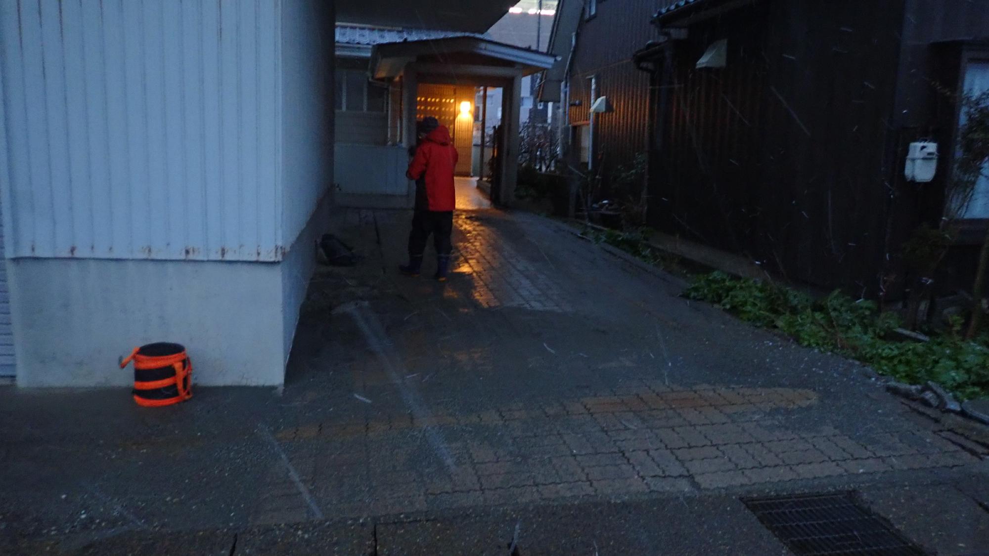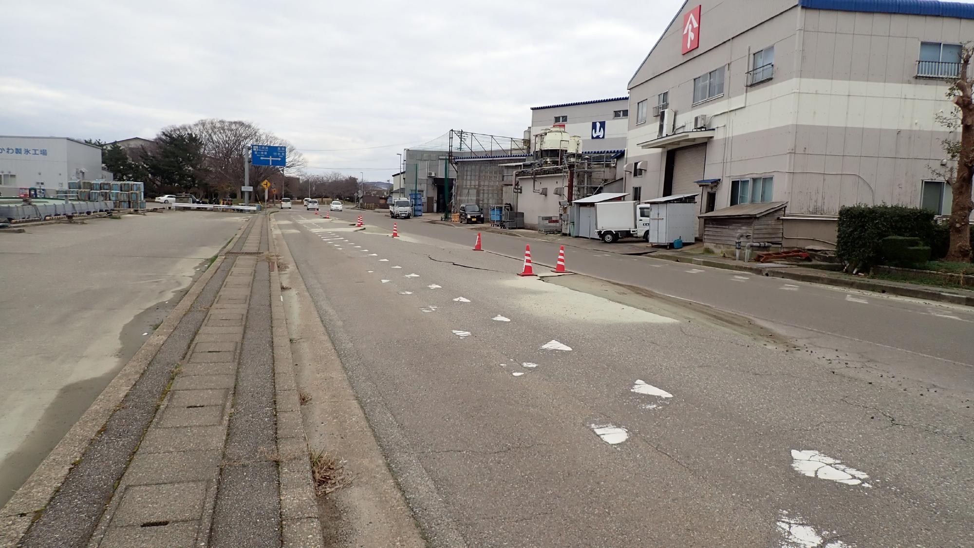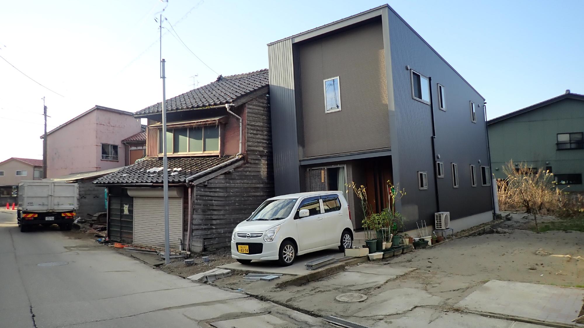 - 高岡市伏木地区では,比較的広域で液状化による噴砂,側溝の圧縮,建物の傾斜が発生していました.氷見と七尾同様に海沿いで,標高差が少ない平坦な地域でしたので,側方流動による建物傾斜や地盤の隆起はあまり確認できませんでした.