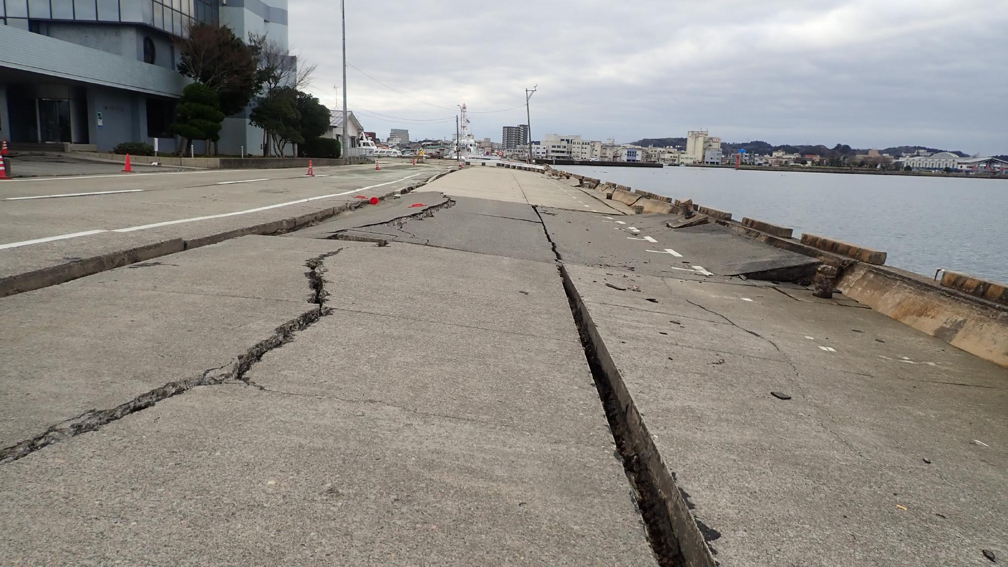 - 七尾市の沿岸では,氷見市同様に道の駅で広域的な液状化が発生していました.一部敷地内の不等沈下による傾斜した建物がありましたが,被害は限定的でした.一方で,海沿いでは護岸エプロン部の亀裂,護岸躯体の海側への移動等の被害が確認されました.