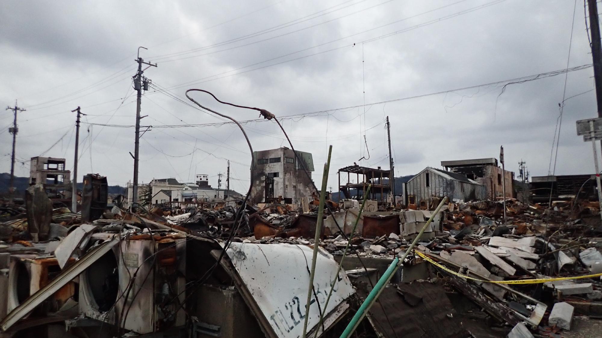 - 珠洲市,輪島市ともに震源に近いため,瓦葺で古い建物の倒壊が至る所で発生していました.液状化による噴砂は小規模ながら確認できましたが,主に埋め戻し土が吹き上がったと予想されます.輪島市河井町では,各種報道でも報じられてましたが,大規模な広域火災の焼け跡が残されてました.焼け落ちたものが多くあり,地盤被害の痕跡を探すことはできませんでした.