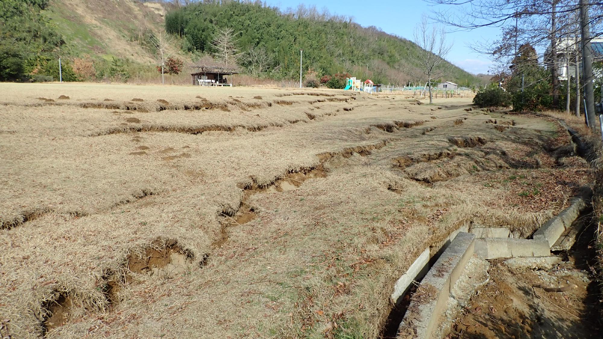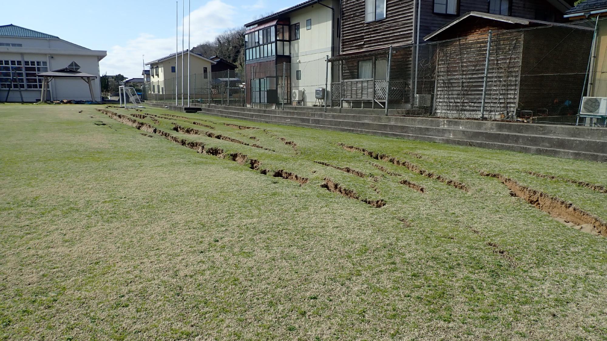 - 被害の大半は地震動による揺すり込み沈下でした.一部,建物外周に沿って埋め戻し土の噴砂が確認されましたが,建物に大きな変状をもたらす程のものではありませんでした.それ以外では,道路の隆起,亀裂等の比較的軽微な変状がありましたが,調査日当日は大分復旧が進んでいました.