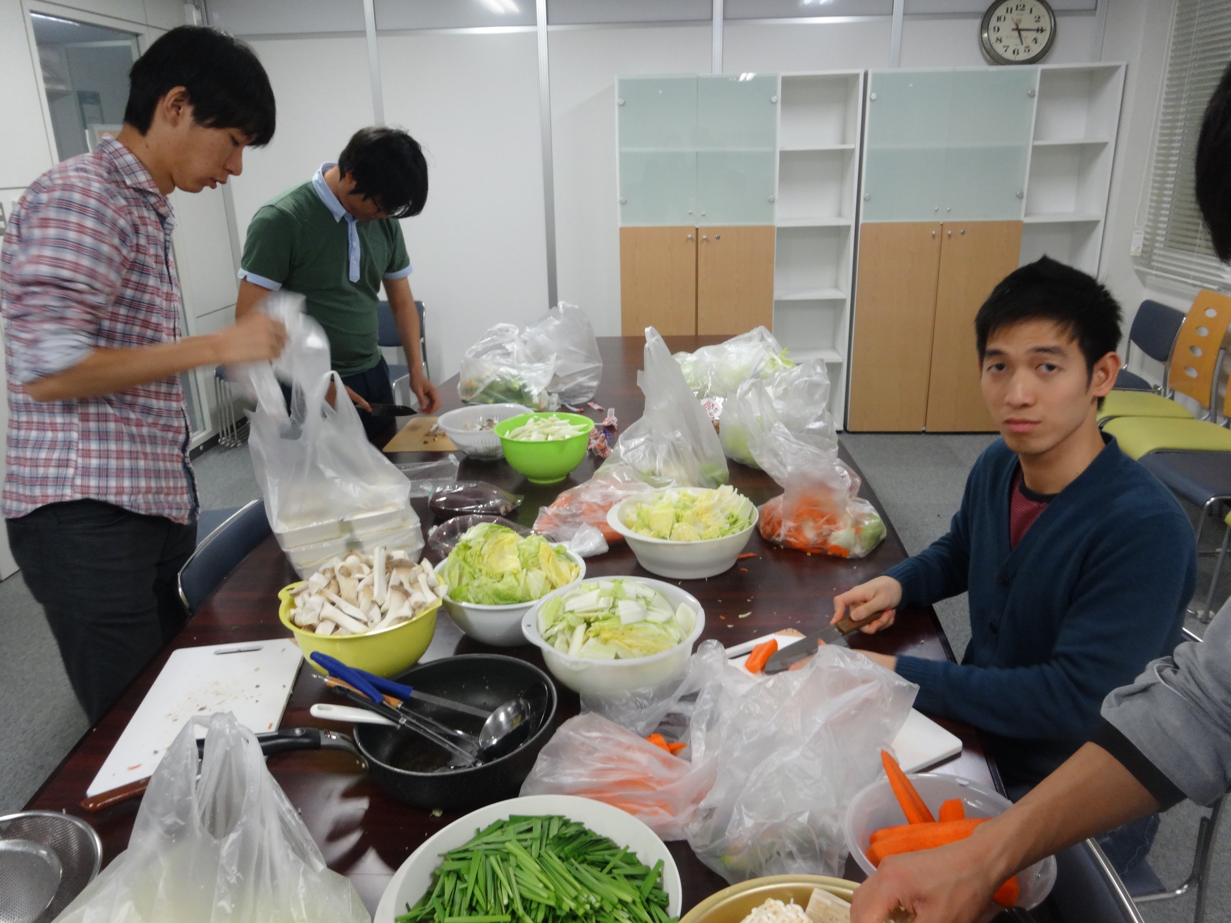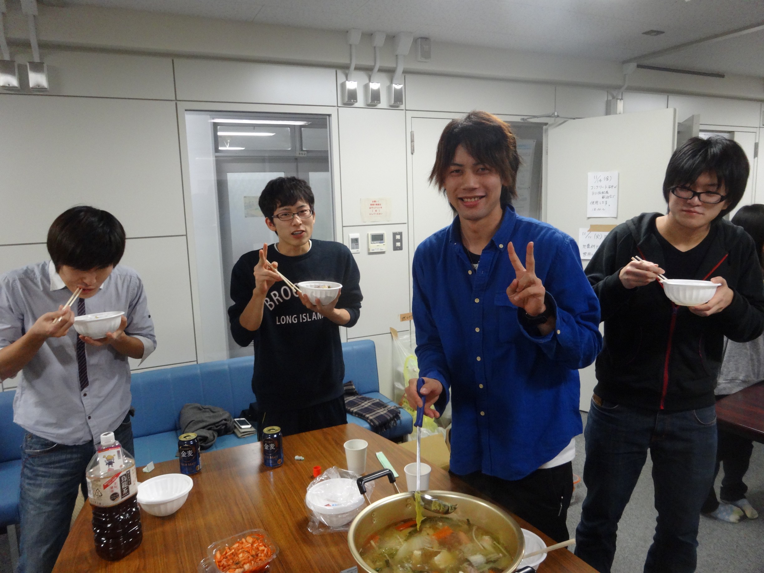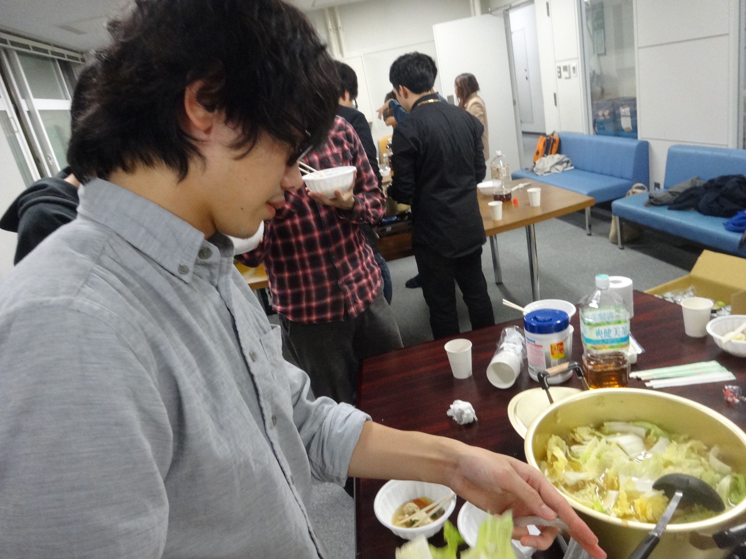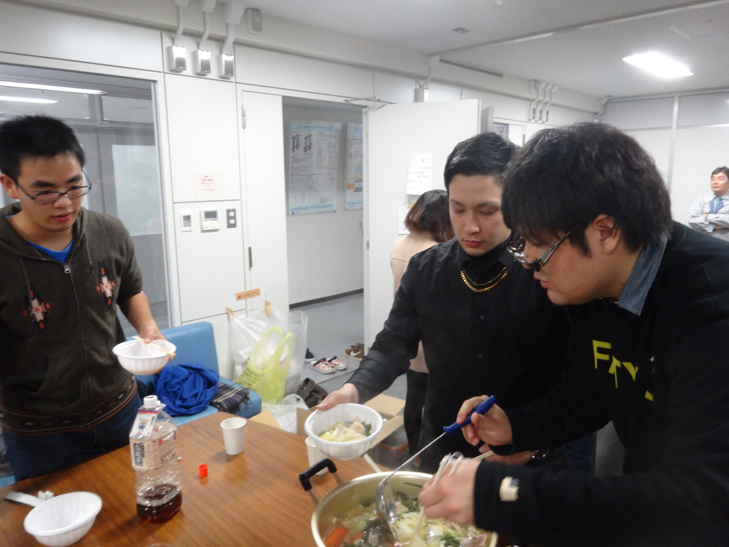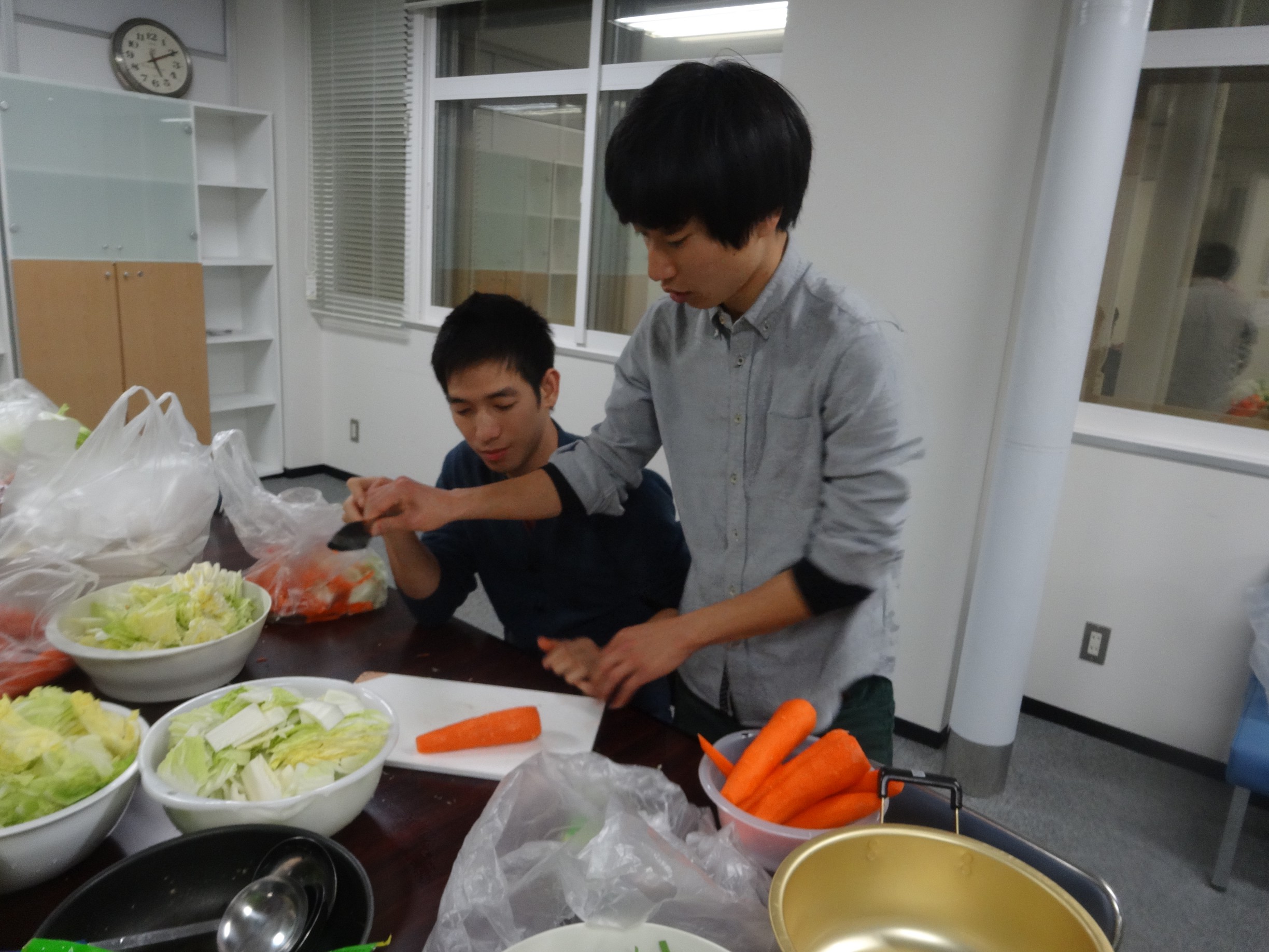 今回の歓迎会では,醤油鍋とキムチ鍋、みそ鍋、塩鍋といったバリエーション豊富な鍋を主体にしたもので,寒くなってきた季節にもぴったりな料理でした.鍋の味もとても美味しく出来上がっていたと思います.準備していた食材もなくなるほどの大盛況と言いたいところですが,1玉85円の白菜に惹かれ9玉買ったのは,大誤算だったと反省しています(笑).しかし,B3をはじめ,みなさんに満足して頂けたと思います.
