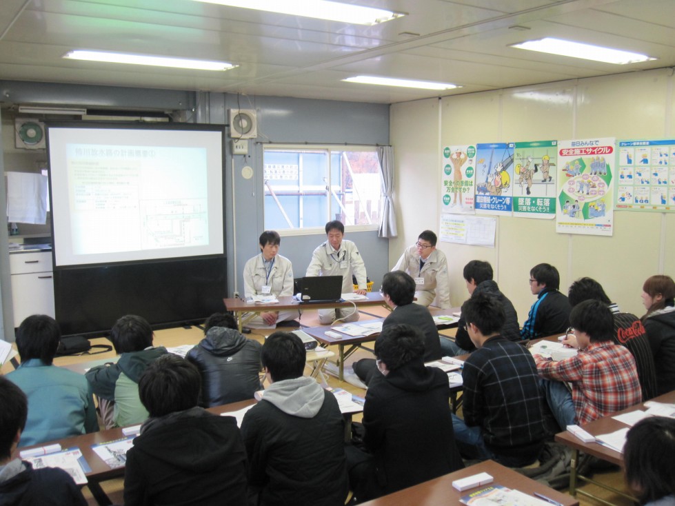 12月3日にB3の建設工学セミナーⅠの授業の一環として,現場見学に行きました.この見学会は,B3のみなさんに土木の魅力を直に感じてもらうことを目的として行っています.今年度は長岡市にある柿川放水路本体工事を見学させていただきました.