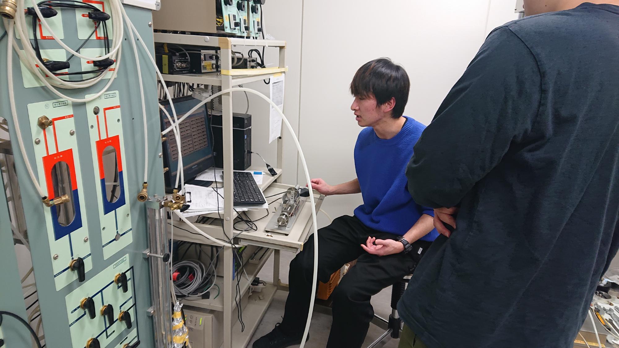 - この取り組みは,B4,M1,M2が組を作って,試験装置に設置されているセンサーのキャリブレーション測定や装置の動作チェックを行い,その結果や測定方法ついて,B4にプレゼンしてもらうイベントです.