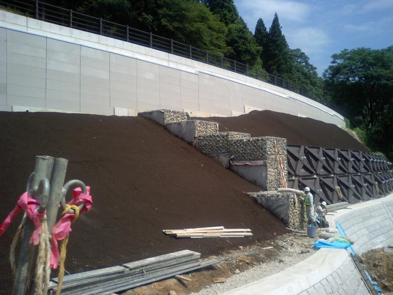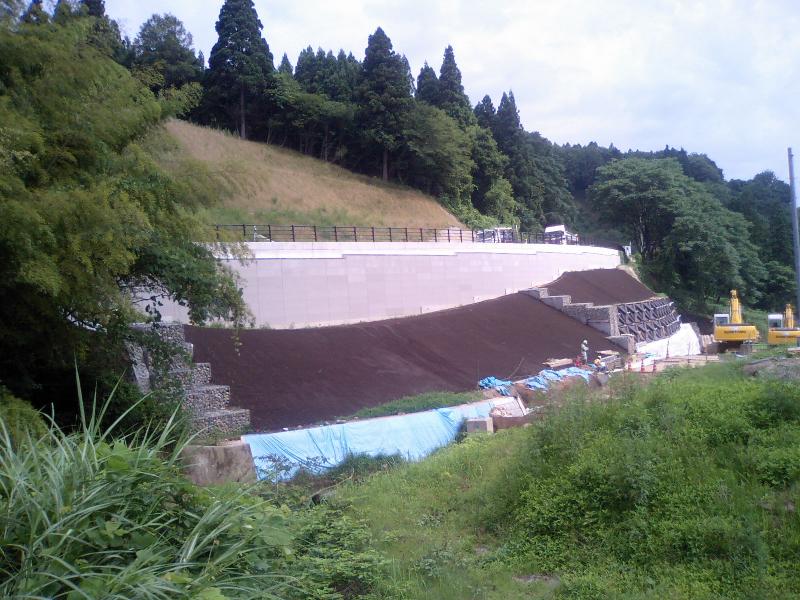- 中越沖地震で大規模な斜面崩壊(被災状況はこちら)が発生し,道路が流されたこの現場の本復旧を見学しました.道路本体は,軽量盛土工法の一種であるEPS工法が採用されておりました.見学当日は盛土工事が完了した後だったため,盛土前面に設置された化粧パネルしか見ることができませんでした.その他,一部河道閉塞した黒川の護岸工および植生工が施されており,道路法面を保護する工事がなされておりました.数ある
