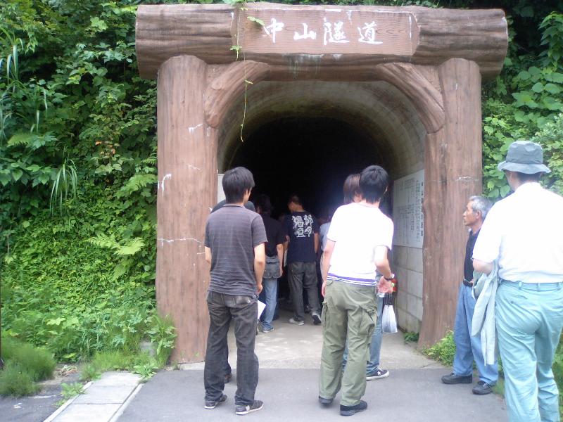 - 昼食後に移動し,日本一の手彫りのトンネルで有名な中山隧道に行きました.この中山隧道は,小松倉から広神村・小出町への抜ける道で,重要な生活道路として集落を支えてきたそうです.平成10年12月に国道291号道路改築工事による隧道に併設して施工された新中山トンネルが開通するまでの約50年間利用されてきたそうです.見学者全員で懐中電灯を頼りに全長877mの隧道を歩いて通りました.隧道の中は寒いし暗いです.湧水が多く濡れました・・・